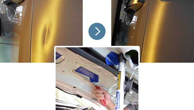 デントリペアでは板金、パテ、塗装修理を行わず、特殊工具を用いて車の隙間からテコの原理を利用してヘコミを押し上げたり、逆に盛り上がっている箇所等には高い所をポンチングしながらボディーなりに仕上げていきます。